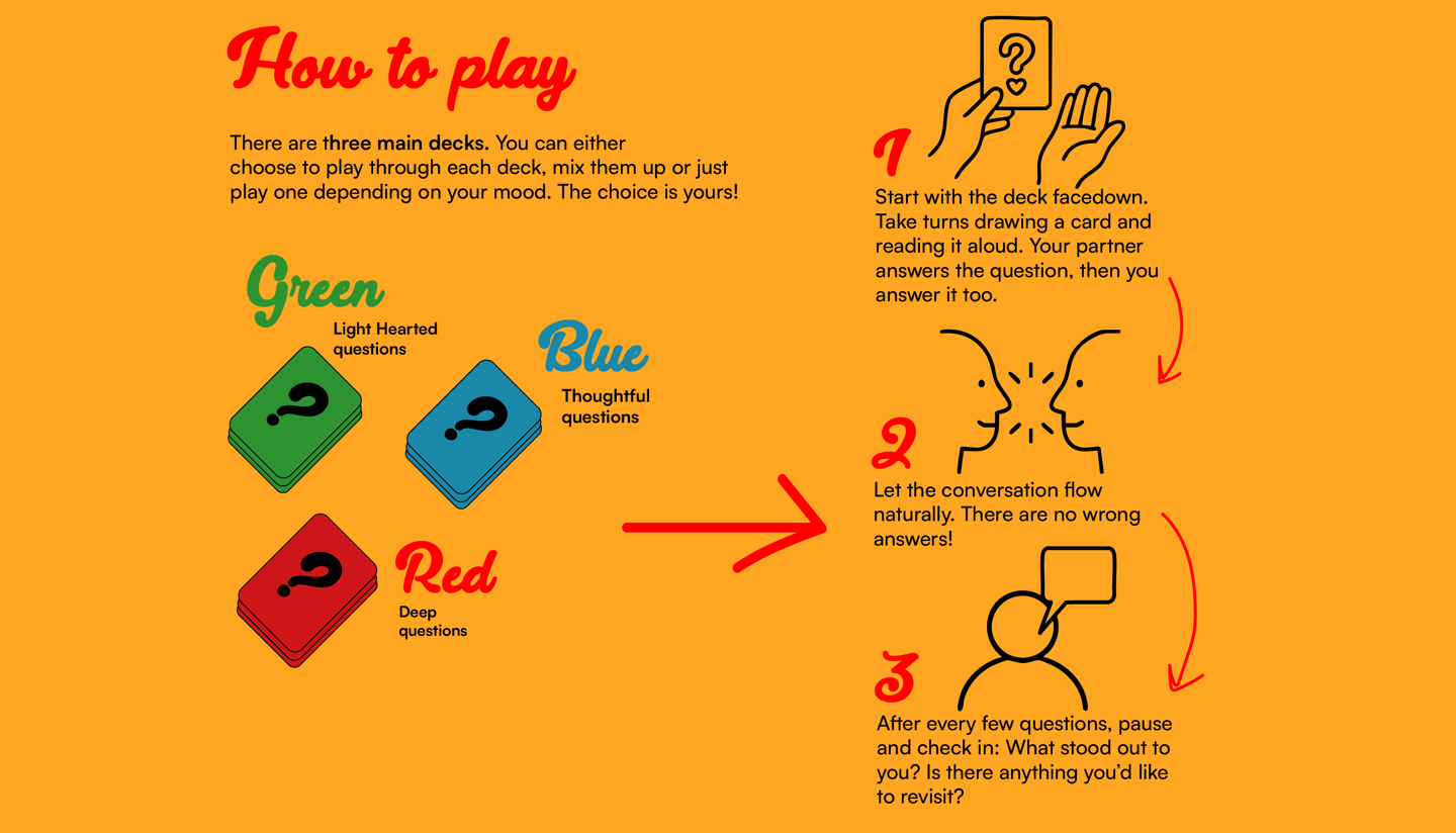 Whether it’s over morning coffee, during a weekend wind-down, or on a spontaneous date night, our game is a gentle reminder to check in, open up, and stay curious about each other.