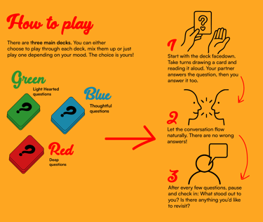 Our card game is designed to spark meaningful, playful, and sometimes vulnerable conversations between partners. With 60 carefully crafted questions, it encourages you to laugh, reflect, and grow closer, no matter how long you’ve been together. We want to help couples build deeper emotional intimacy through intentional dialogue.
